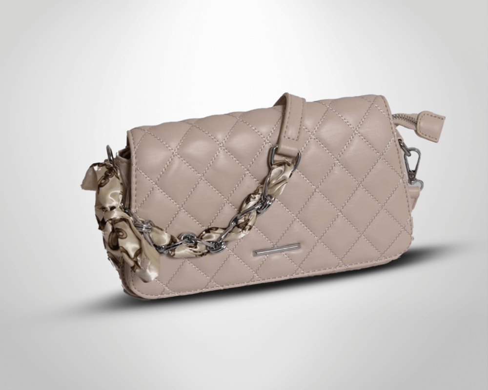 أضيفي لمسة من الأناقة والفخامة على إطلالتك اليومية مع شنطة يد ماركة المضّلعة والمزودة بحزام معدني.